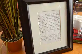 I could have photocopied it and made the margins a bit smaller, but I wanted the “real deal” in the frame. I love the texture of the plain notepaper along with the real ink of her handwriting. Glancing at that note inspires me for more than just the meaning of the words. It also brings back the memory of Sharon and our conversation at that camp dining room table. She encouraged my heart. She made me feel so cared for. And she inspired me to do that for others.