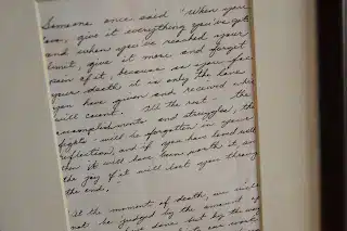 My heart aches, and I instantly remembered the beautiful gift she gave me after that after dinner conversation. It was a handwritten note with some of the quotes we had discussed in our conversation.