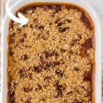 Step 4: Sprinkle the crisp streusel topping over the filling mixture in the 9×13 inch pan. Sprinkle with chopped pecans.