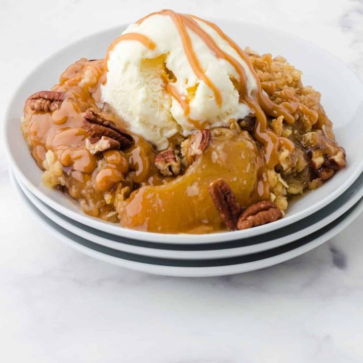 A drizzle of caramel topping makes a perfect finishing touch for this melt in your mouth apple dessert!