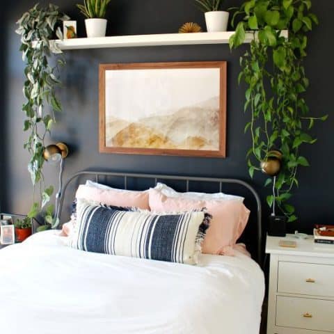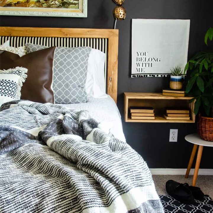 I just love everything about this room! The pop of white against the dark wall color plus the mix of textures in the bedding and wall art is just perfection! And, sidenote, Cynthia Harper is one of my favourite follows on Instagram. She has amazing DIY projects!