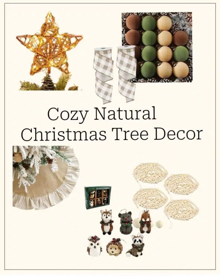 - Try a Monochromatic look – Last year I decided to try neutral Christmas tree decor with a mix of creams, browns, & wood tones. With the white twinkling lights, I just loved how it looked in our Dining room. (It’s pictured at the top of this post.) Below are some similar items found in my Amazon shop.