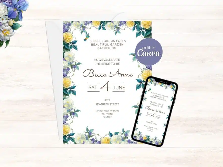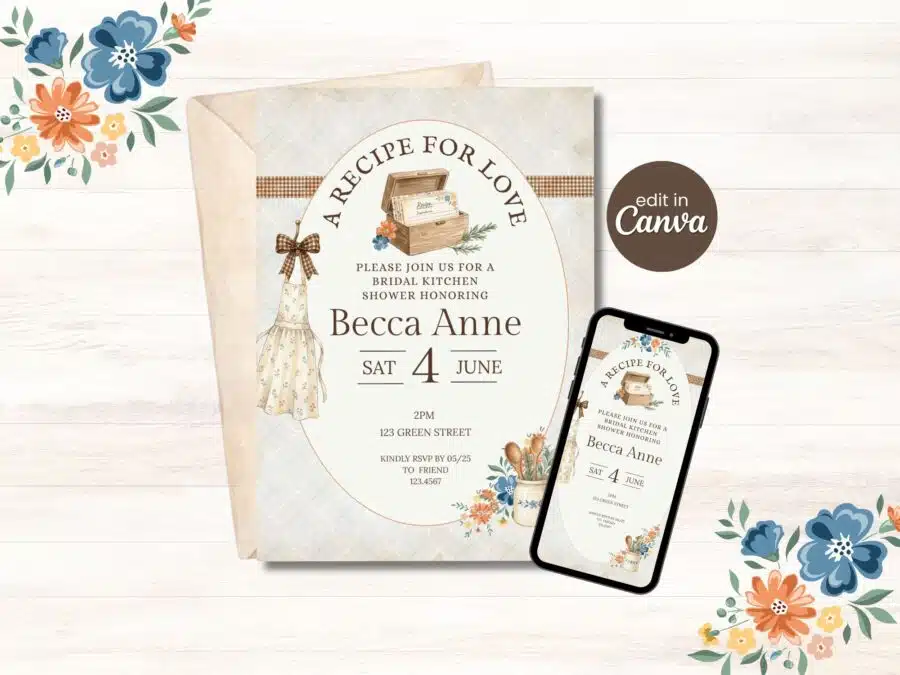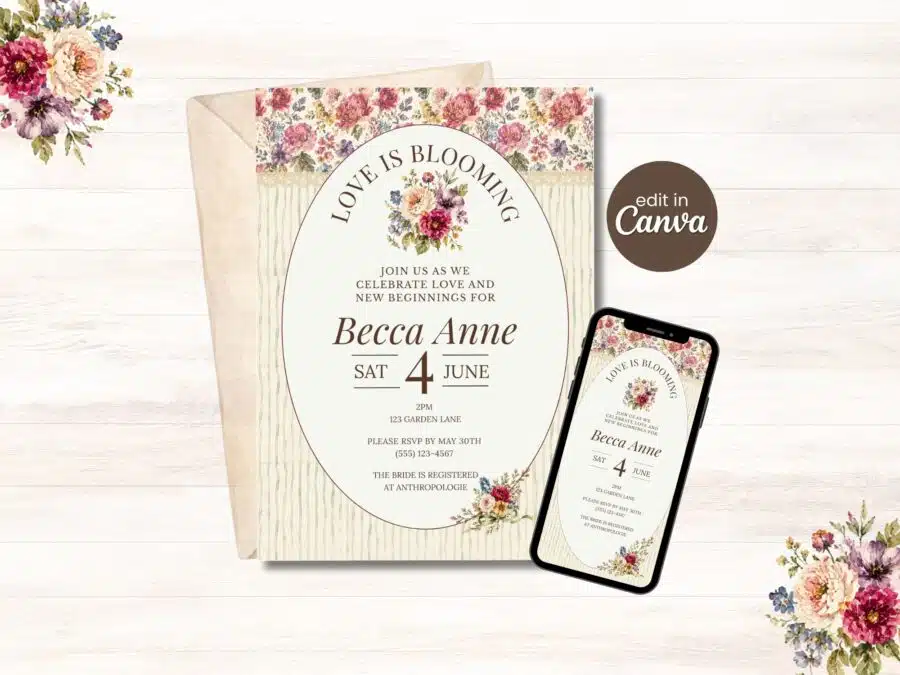 - Editable invitations made easy: These bridal shower invitations online are fully customizable in Canva, so you can easily change the bride’s name, date, and details.